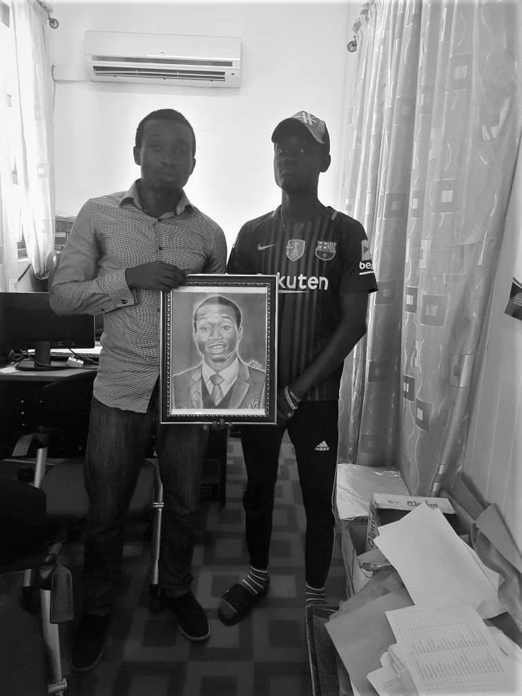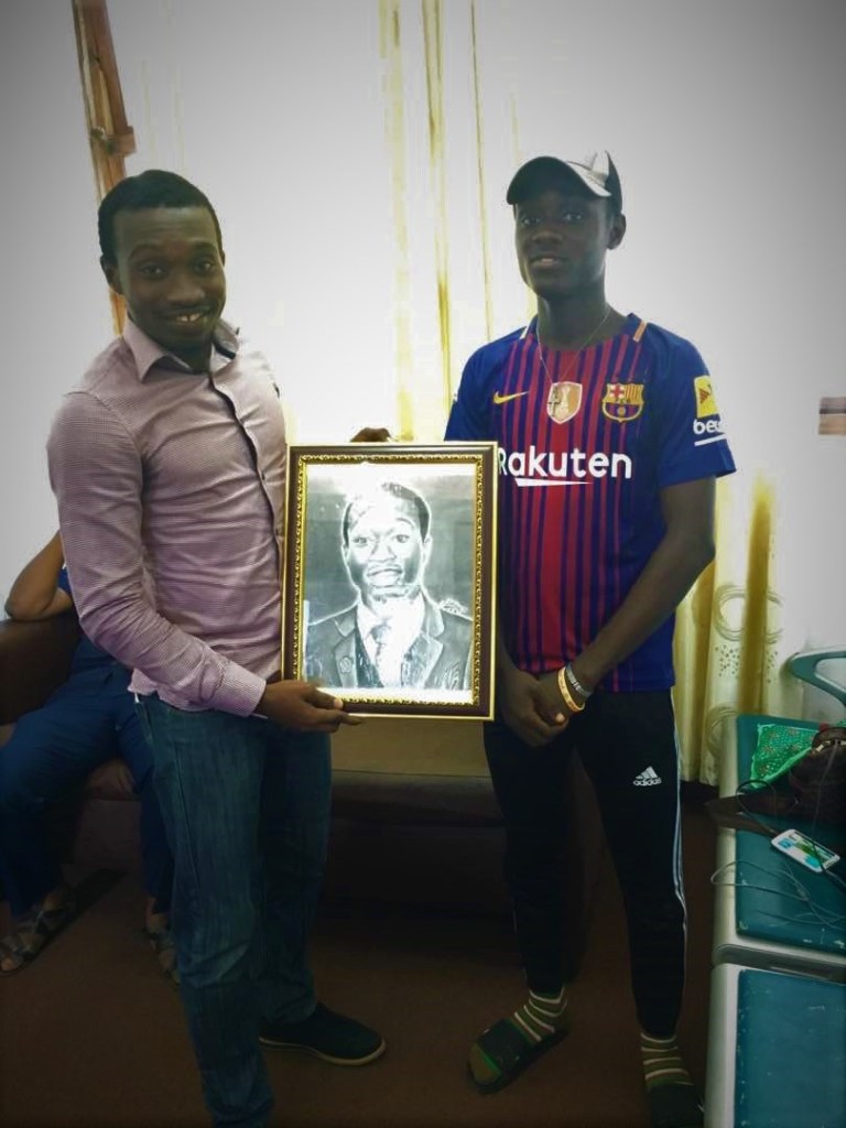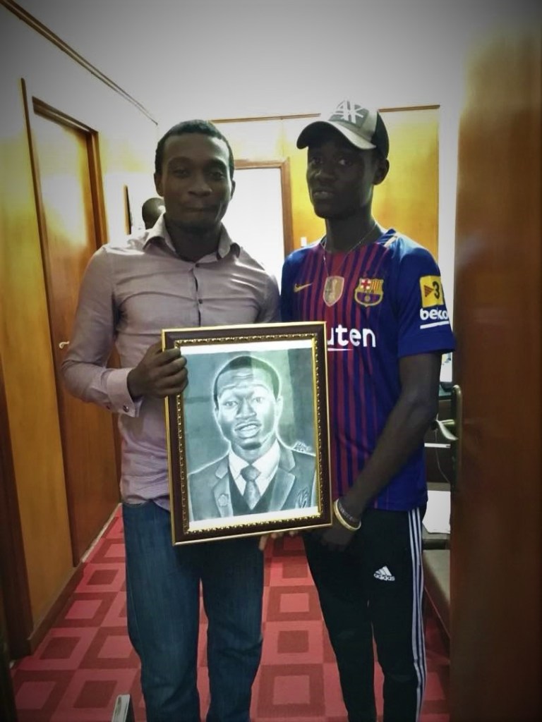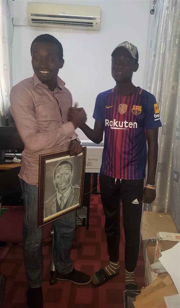 “So on Monday, the sixth day of August, 2018, I got a clandestine call that Benson had something for me so I arranged for him to pass by the office later on. I was so elated to realize that he had a painting of me and he wanted to hand it over. Honestly I have always fancied something like that looking at my numerous struggles to edit my pictures to appear as painted. Only Pencil Sketch and Paint apps can affirm this fact! The last time I spoke to Benson was when he and his Sister wanted discuss his potentials and how best to monetize his talent. I reminisce recommending that he focused on his Senior High School education when he mentioned that he was studying visual arts. He was in the right class sort of! I further asked them to ignore the monetization drive and focus on his talent development which I think they later understood. He just completed high school and has showed appreciation for our friendship already.”